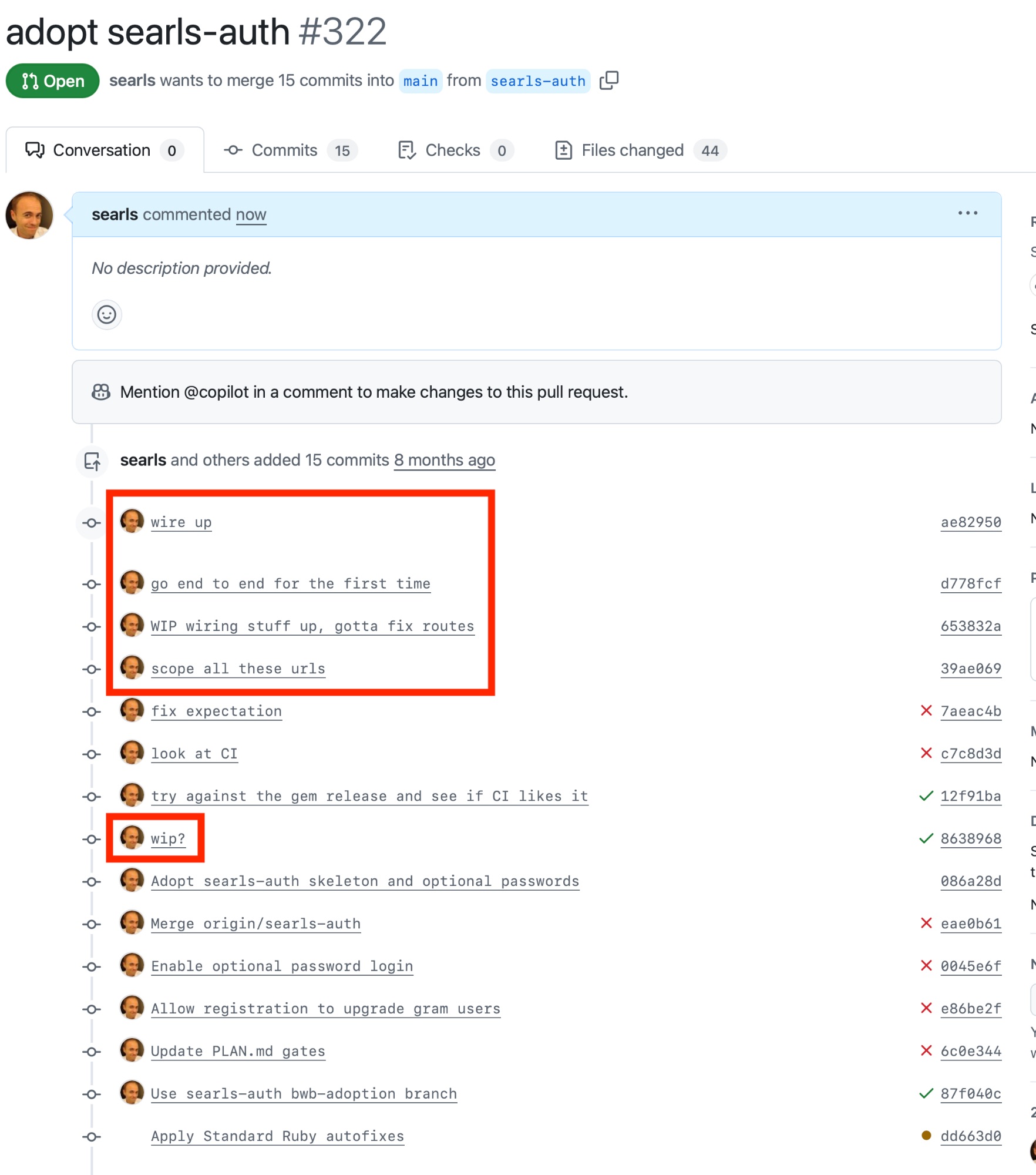 We were gone most of the day so I told Codex CLI to migrate Better with Becky to my searls-auth gem and to commit & push regularly to a PR so I could review remotely. Just noticed that it must have looked through the git history in order to write commit messages that match my own. Seriously thought I wrote half of these before I realized as much.