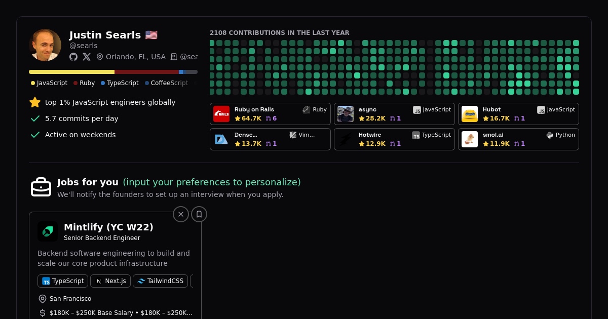 A recruiter sent me this screenshot of some kind of GitHub profile scraper. Aside from naming me as a "top 1%" JavaScript developer (which I'm not sure is a compliment or a threat…), I just couldn't get over the "active on weekends" checkmark.